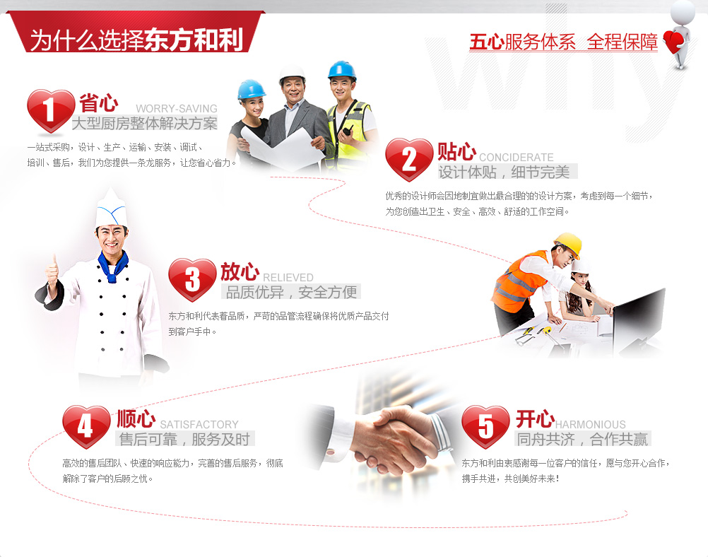 廚房工程建設(shè)是一項(xiàng)龐大復(fù)雜的系統(tǒng)工程,既需要與后勤工作人員、廚師溝通協(xié)調(diào), 又要與土建、裝修、機(jī)電、暖通等工程人員相互配合,工作量十分巨大。同時還要采購眾多的食品機(jī)械、工具,這對沒有相關(guān)經(jīng)驗(yàn)的我們來說確實(shí)是一個挑戰(zhàn)。有時候我們面對廚師提出的長長的采購需求清單就已經(jīng)眼花繚亂了。 幸好東方和利提供的是整體解決方案,從前期的設(shè)計(jì)咨詢到后期的安裝調(diào)試、從大型設(shè)備到餐具小件,包括各種食品機(jī)械,排煙通風(fēng),這些瑣碎事情都由東方和利來完成,為我們提供量身定制的解決方案。一站式采購為我們節(jié)省了大量精力,而且所有廚具都由東方和利來保修,對我們來說也更加方便。總之,東方和利的服務(wù)讓我們非常省心,我很滿意。
